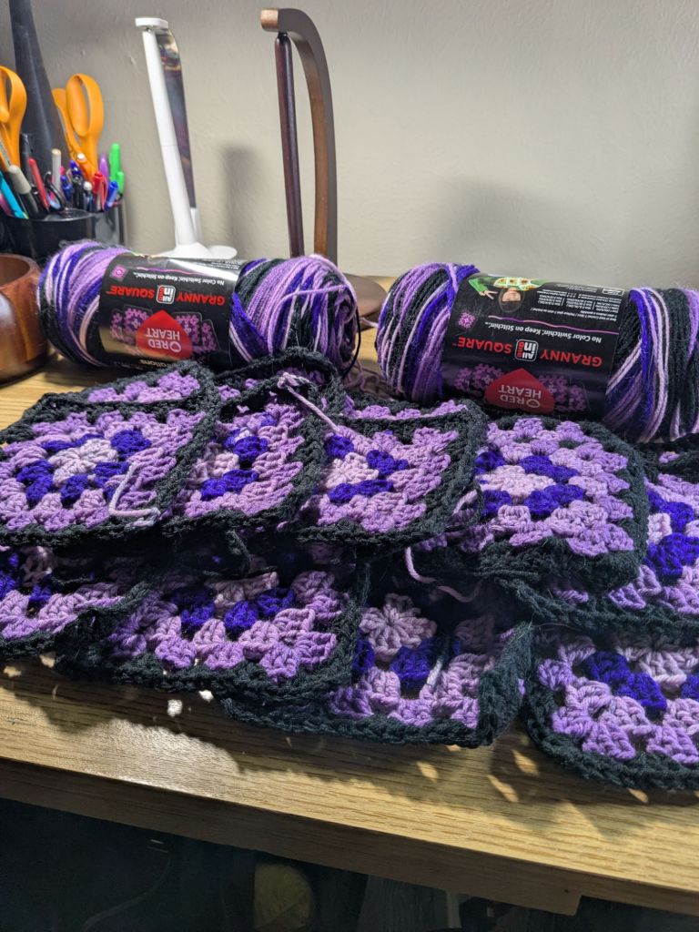 For my crochet project, I will be working on a granny square cardigan using Red Hearts All In One Granny Square yarn, Black-Grape Granny colorway.