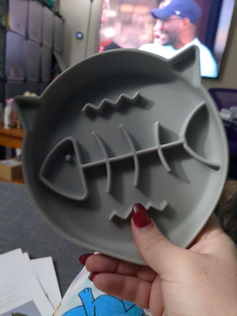 The vet said at the last visit that all my cats are overweight. They’ve been put on diets and the change has not gone over well. Steve in particular will eat all his food too fast and then hork it up. So we are using slow feeders to hopefully prevent this from happening. I found these cute silicone ones that are dishwasher safe and have little suction cups on the back to keep them from sliding around.