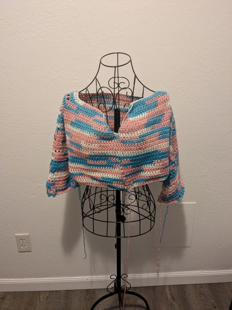 Transgender recognition is also important to me. As a NB person, I fall under the trans umbrella, but not only that, I have a lot of transgender friends who deserve to be proud of who they are. With that in mind, I’ve been working on designing a shirt in transgender flag colors. This yarn came from Joann Fabric and I’m hoping that Michaels picks it up now that JF is closed.