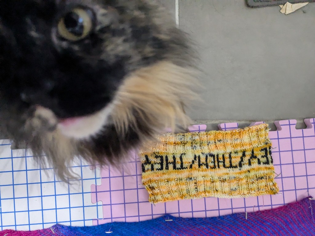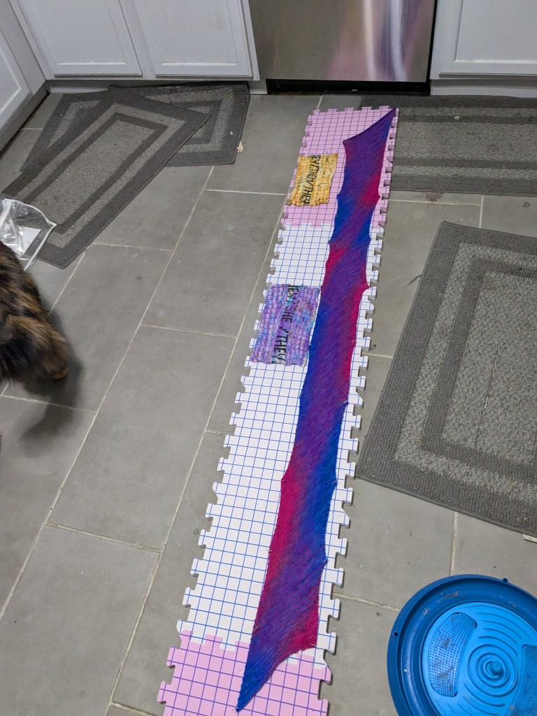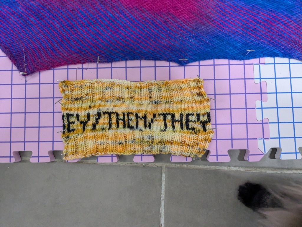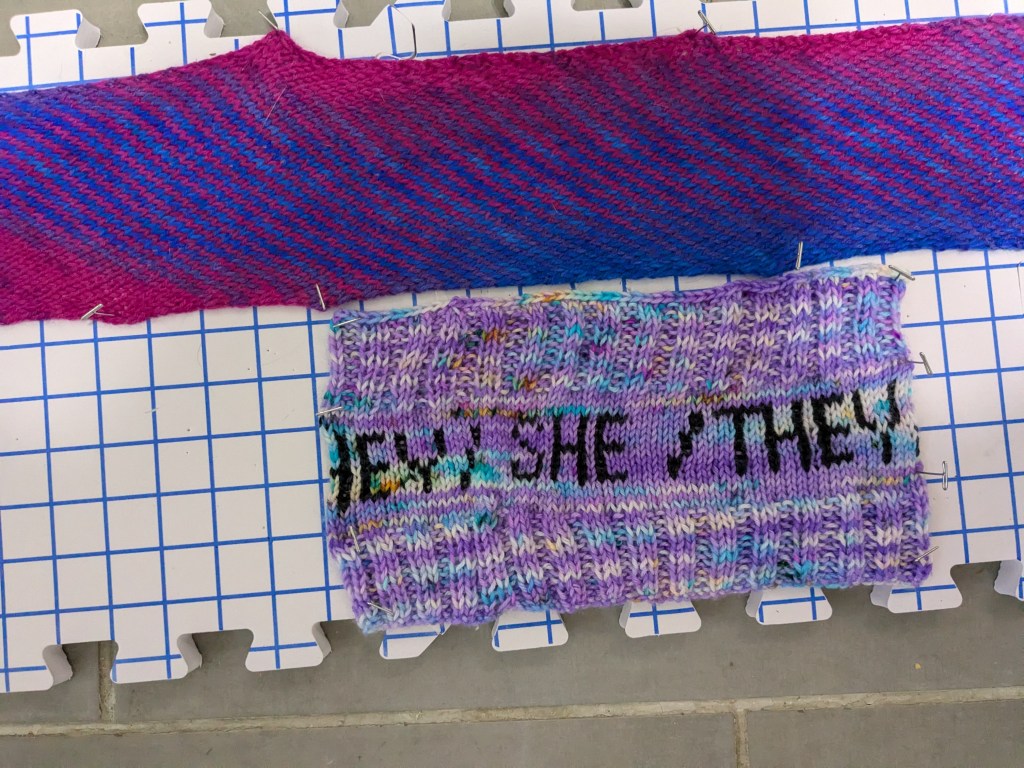This week it’s not really WIPs but rather FOs. I am now working on a set of 10 pronoun ear warmers featuring Hue Loco’s Hot Mess and Say Less sets. I also finished a bisexual pride scarf and the accidental pooling is amazing.